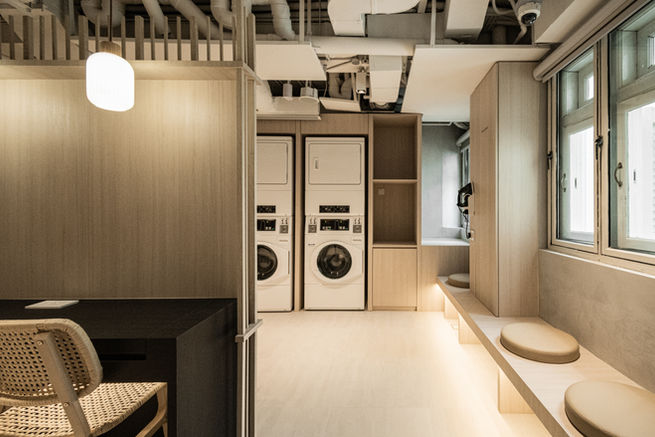 Arriving at the hotel, automated check in counters provide access cards that lead guests to level 2, with a reception space that houses a communal dining table, pantry and tea pavilion. The third floor features a laundromat, ironing facility and dressers behind a timber lattice screen. Neutral woods, pale cement screed, original artwork and sage green accents pull together to form a calming space. Elements of cantonese theatre stages inspired the overlap details of screens in the hotel. Navigating ceiling height and SCDF guidelines governing capsule hotels, each Jyu capsule bed is fitted with individual aircon vents with adjustable air flow, sprinklers, a flip down table and a safe box.
