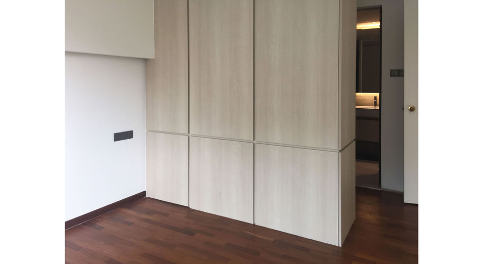 This condominium apartment features bifold windows that transforms the kitchen counter into an open bar. A palette of greys and walnut wood are peppered throughout the home through furniture choices and details.